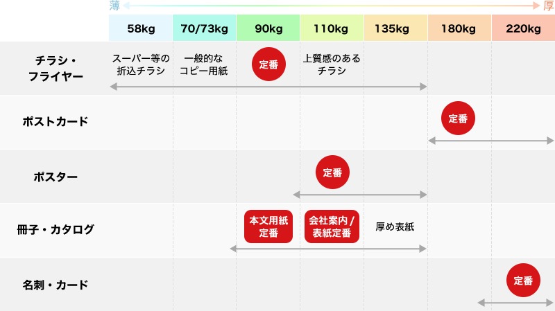紙の厚さは、○○kgという斤量(きんりょう)を用いて表します。数値が低いほど薄く、高いほど厚くなります。