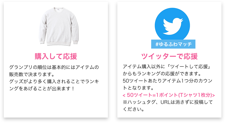 ランキングの投票は、①オリジナルアイテムの購入と②ツイート応援があり誰でも気軽に登録一切不要で参加できますのであなたの推しのメンバーをCMに出演させるために投票しよう。