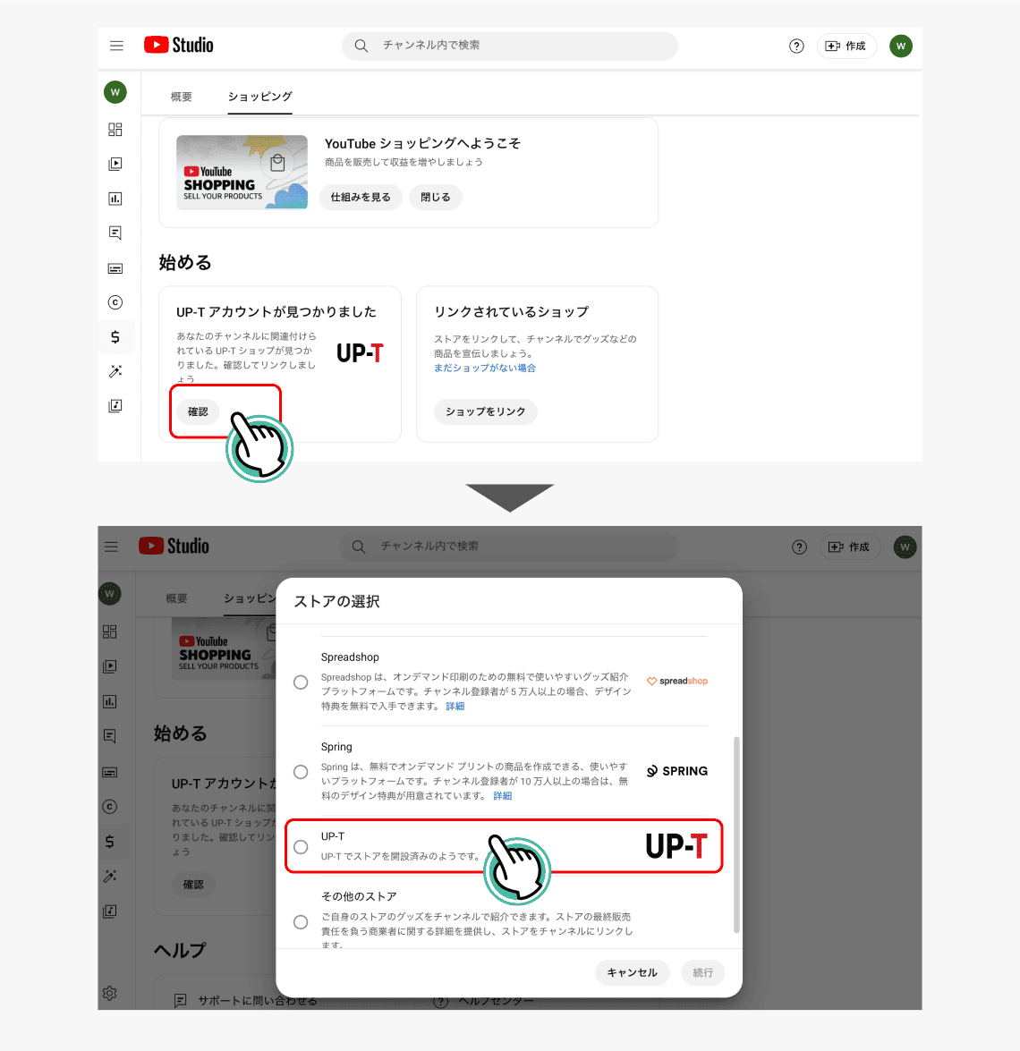 UP-Tアカウントの「確認」をクリックしてストアを選択!