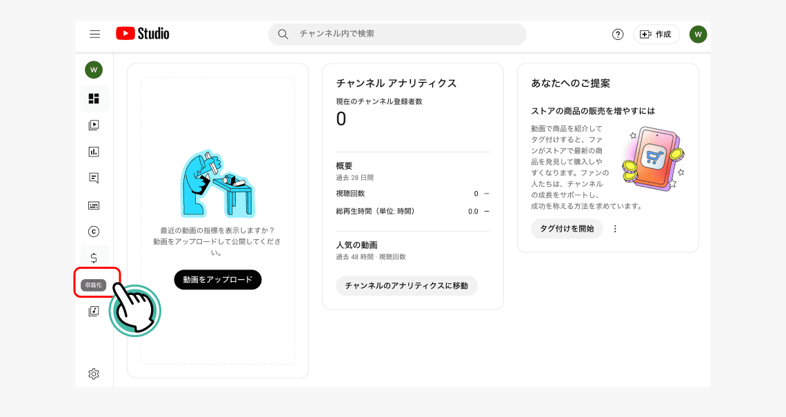 YouTube Studioを開いて「収益化」をクリック!